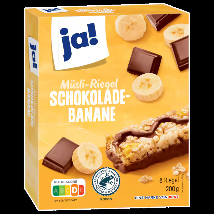 المكونات: شوكولاتة بالحليب ٢٤٪ (سكر، مسحوق حليب كامل الدسم، كتلة الكاكاو¹، زبدة الكاكاو¹، مستحلب (ليسيثين))، أوليغوفروكتوز، رقائق حبوب (دقيق قمح، دقيق ذرة، دقيق أرز، سكر، زيت دوار الشمس، عامل رفع (كربونات الصوديوم))، رقائق شوفان كاملة ١٠٪، رقائق قمح كاملة، شراب الجلوكوز والفركتوز، رقائق ذرة (ذرة، مستخلص شعير مملت)، رقائق موز محلاة ٥٪ (موز ٥٦٪*²، دهن جوز الهند، سكر، نكهة طبيعية)، رقائق شعير كاملة، زيت دوار الشمس، عسل، مرطب (جلسرين)، ملح، نكهة طبيعية، مستحلب (ليسيثين).
