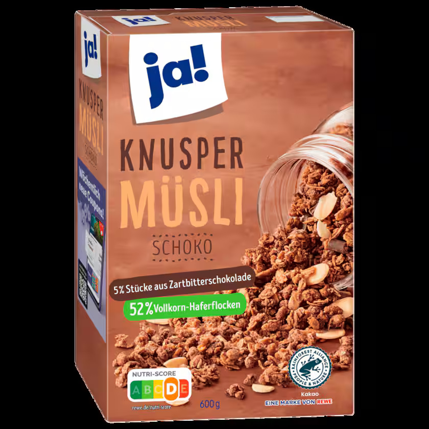المكونات: شوفان كامل الحبة ملفوف ٥٢٪، سكر، زيت نخيل، بولي دكستروز، شوكولاتة داكنة ٥٪ (سكر، كتلة كاكاو، زبدة كاكاو، مستحلب: ليسيثين)، منتج حبوب (جريش ذرة، سكر، دقيق قمح، مسحوق كاكاو قليل الدسم، مسحوق حليب خالي الدسم، ملح)، لوز شرائح ٤٪، مسحوق كاكاو قليل الدسم، رقائق ذرة (جريش ذرة، سكر، ملح، مستخلص شعير مملت)، دقيق قمح كامل الحبة، ملح.