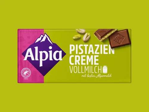 شوكولاتة حليب جبال الألب محشوة بكريمة حليب بنسبة ٥٠٪ مع الفستق (نسبة الكاكاو: ٣٠٪ كحد أدنى)