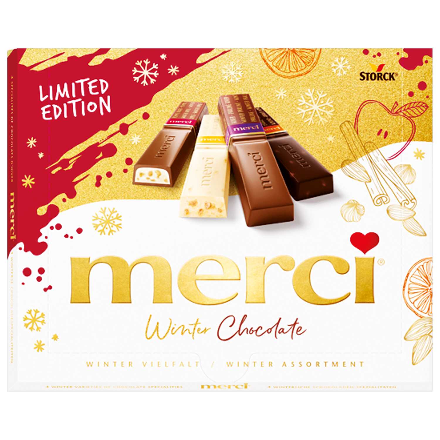 سكر، زبدة الكاكاو، كتلة الكاكاو، مسحوق الحليب كامل الدسم، دهون نباتية (نخيل، شيا)، مسحوق الكريمة، مسحوق الحليب منزوع الدسم، لاكتوز، لوز مفروم (1.5%)، مسحوق اللبن الرائب، دقيق القمح الكامل، دكستروز، بندق (1.2%)، زبدة مصفاة، عصير فواكه مركز (برتقال، ليمون)، ذرة، مستحلب ليسيثين (صويا)، زبدة، كاكاو قليل الدسم، قطع تفاح، منكهات، ملح، نشا القمح، عامل تبلور بكتين، بهارات سبيكولوس، عوامل رفع (بيكربونات الصوديوم، بيكربونات الأمونيوم)، مستخلص الشعير المملت، حمض الستريك، قشر برتقال. #قد يحتوي أيضًا على الفول السوداني، مكسرات أخرى، وبيض.