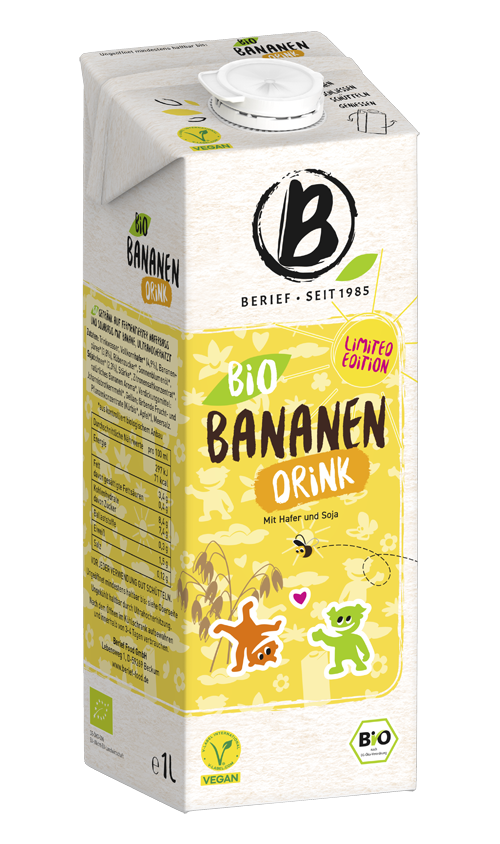 المكونات: ماء الشرب، شوفان كامل الحبة* (4.9%)، هريس الموز* (3.8%)، سكر البنجر*، زيت دوار الشمس*، فول الصويا* (2.3%)، نشا*، مركز عصير الليمون*، نكهة الموز الطبيعية*، مواد مكثفة: صمغ الخروب*، صمغ جيلان؛ مركزات الفاكهة والنباتات الملونة (اليقطين*، التفاح*)، ملح البحر.