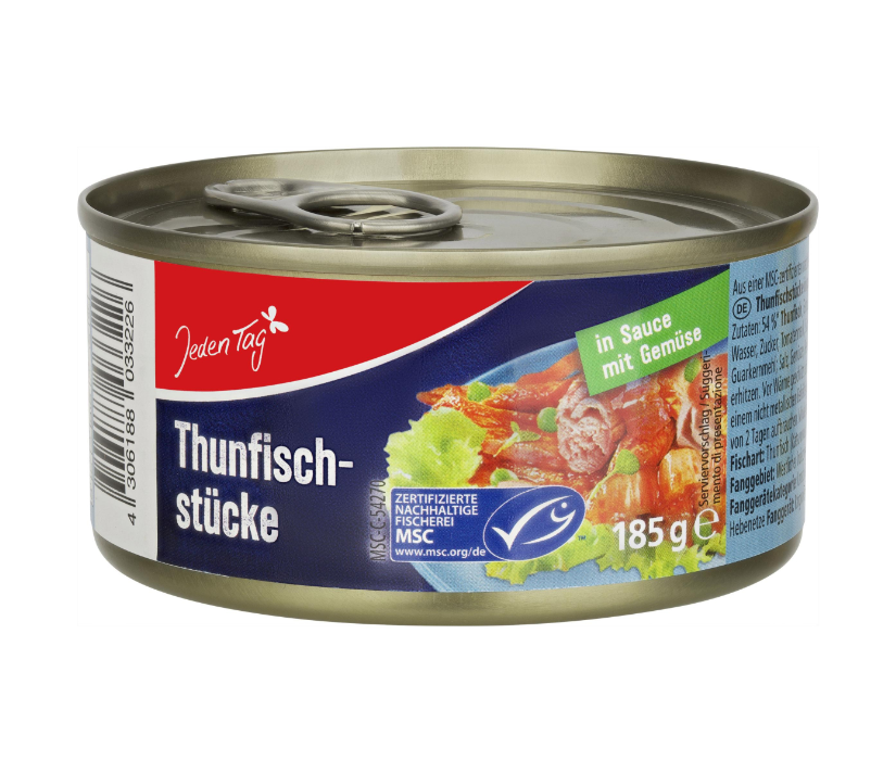 ٥٤٪* تونة (كاتسوونوس بيلاميس)، خضراوات (١٤٪ بصل، ٤٪ بازلاء)، ماء، سكر، معجون طماطم، زيت دوار الشمس، مُكثِّف: صمغ الغوار؛ ملح، بهارات، خل أرز.