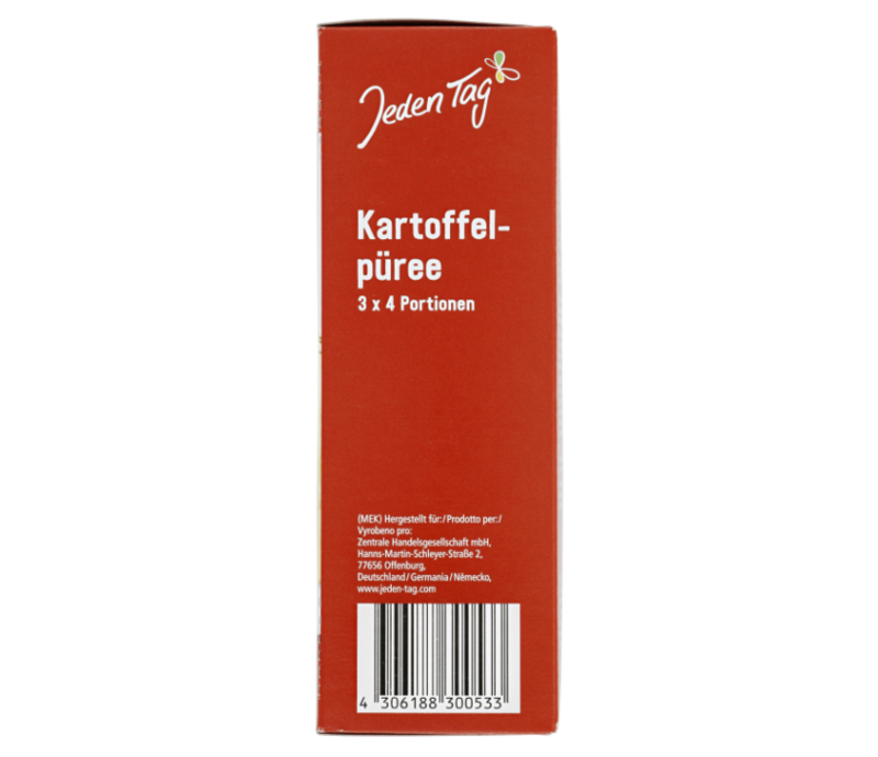 ٩٩٪ بطاطس، مستحلب: أحادي وثنائي جليسريدات الأحماض الدهنية؛ مضاد للأكسدة: إسترات الأحماض الدهنية لحمض الأسكوربيك، ميتابيسلفيت الصوديوم، كركم. معبأ في جو واقٍ. قد يحتوي على آثار من الحليب.