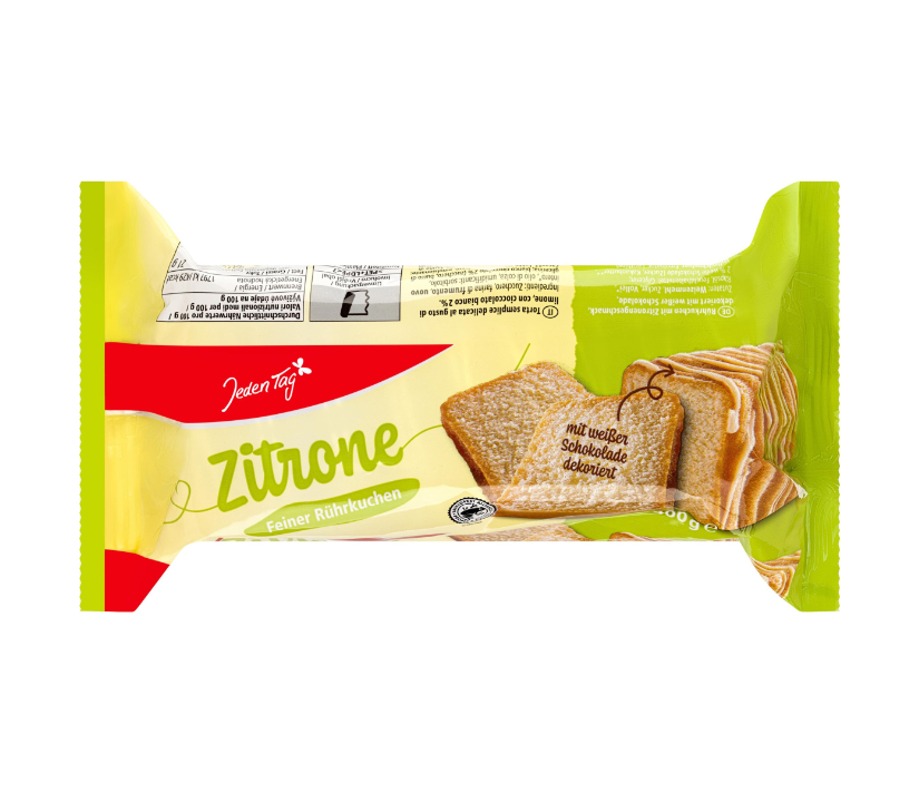 سكر، دقيق قمح، بيض كامل*، زيت بذور اللفت، مرطبات: سوربيتول، جلسرين؛ ٢٪ شوكولاتة بيضاء (سكر، زبدة كاكاو**، مسحوق حليب خالي الدسم، زبدة مركزة، مستحلب: ليسيثين)، شراب الجلوكوز والفركتوز، دقيق أرز، ملح، مستحلب: أحادي وثنائي جليسريد الأحماض الدهنية؛ نشا قمح، زيت قشر الليمون، زيت قشر الليمون الأخضر، منظم حموضة: أسيتات الصوديوم؛ عوامل تخمير: ثنائي الفوسفات، كربونات الصوديوم. *بيض من دجاج يبيض في الحظائر. **معتمد من تحالف الغابات المطيرة. قد يحتوي على آثار من المكسرات.