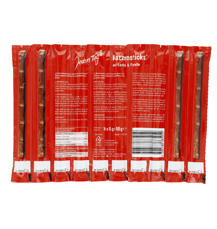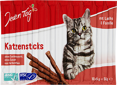 علف تكميلي للقطط. أعواد مضغ للقطط بنكهة السلمون والسلمون المرقط.