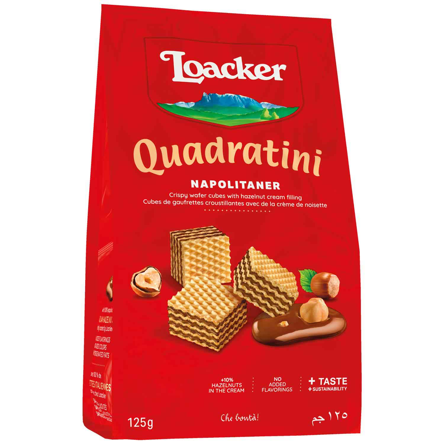 ستة جوانب من المتعة الخالصة. ستأسر حلوى لواكر كوادراتيني نابوليتانر براعم ذوقك. تتوسط خمس طبقات رقيقة ومقرمشة من رقائق الويفر كريمة بندق عطرية تذوب في الفم، تفوق أعلى التوقعات. هذه الحلوى اللذيذة على شكل مكعبات من رقائق الويفر مثالية لتناولها كوجبة خفيفة، وهي تستحق كل لحظة من المتعة.
