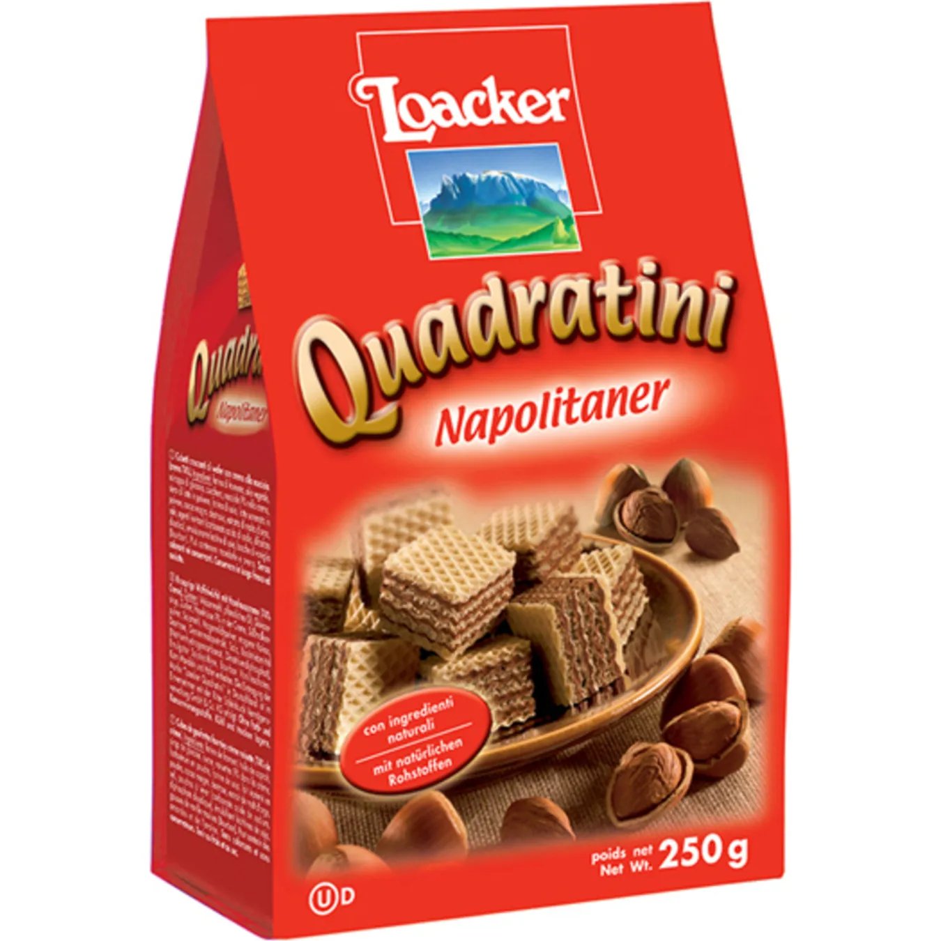 مكعبات رقائق مقرمشة مع كريمة البندق. خالية من النكهات والألوان الاصطناعية. في كيس قابل لإعادة الإغلاق.