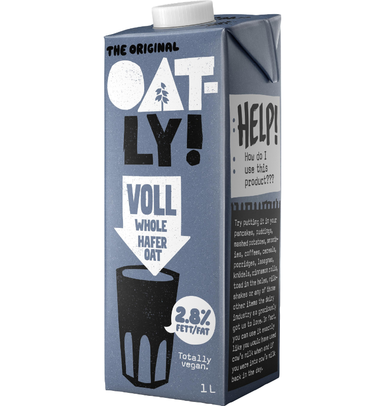 ماء، شوفان ١٠٪، زيت بذور اللفت، منظم حموضة (فوسفات ثنائي البوتاسيوم)، معادن (كربونات الكالسيوم، يوديد البوتاسيوم)، ملح، فيتامينات (د٢، ريبوفلافين، ب١٢).